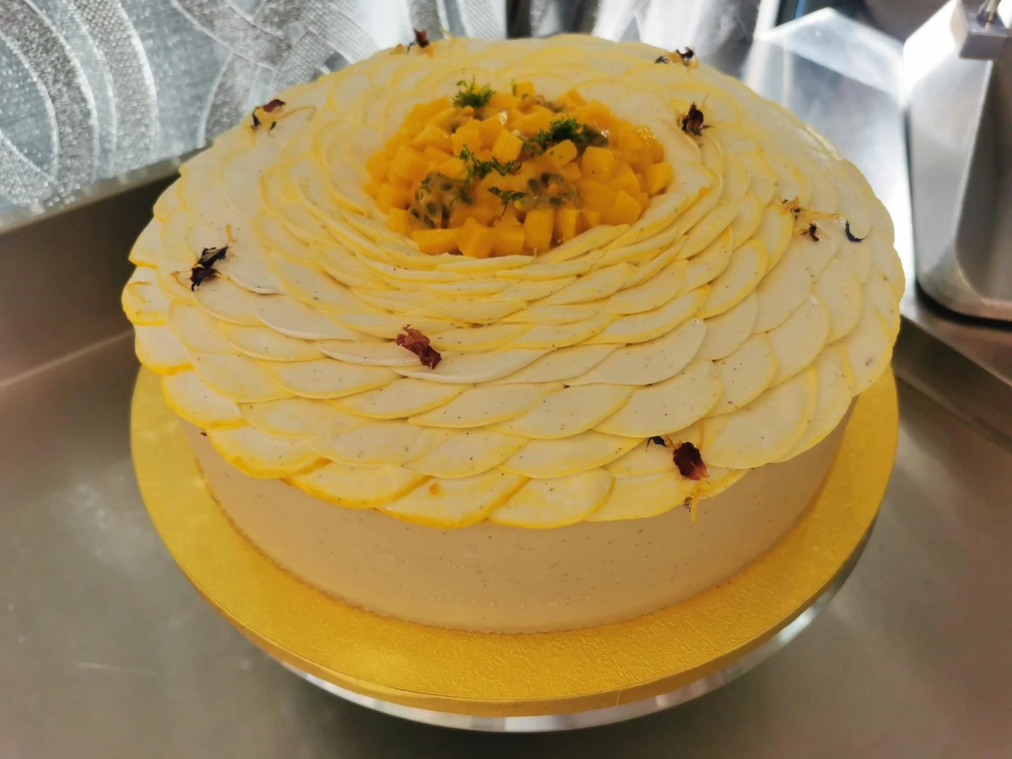 Gâteau en forme de chiffre 0 décoré avec des morceaux de mangue, des passion fruits, des petites meringues blanches, et un décor jaune, posé sur une surface brillante dorée.