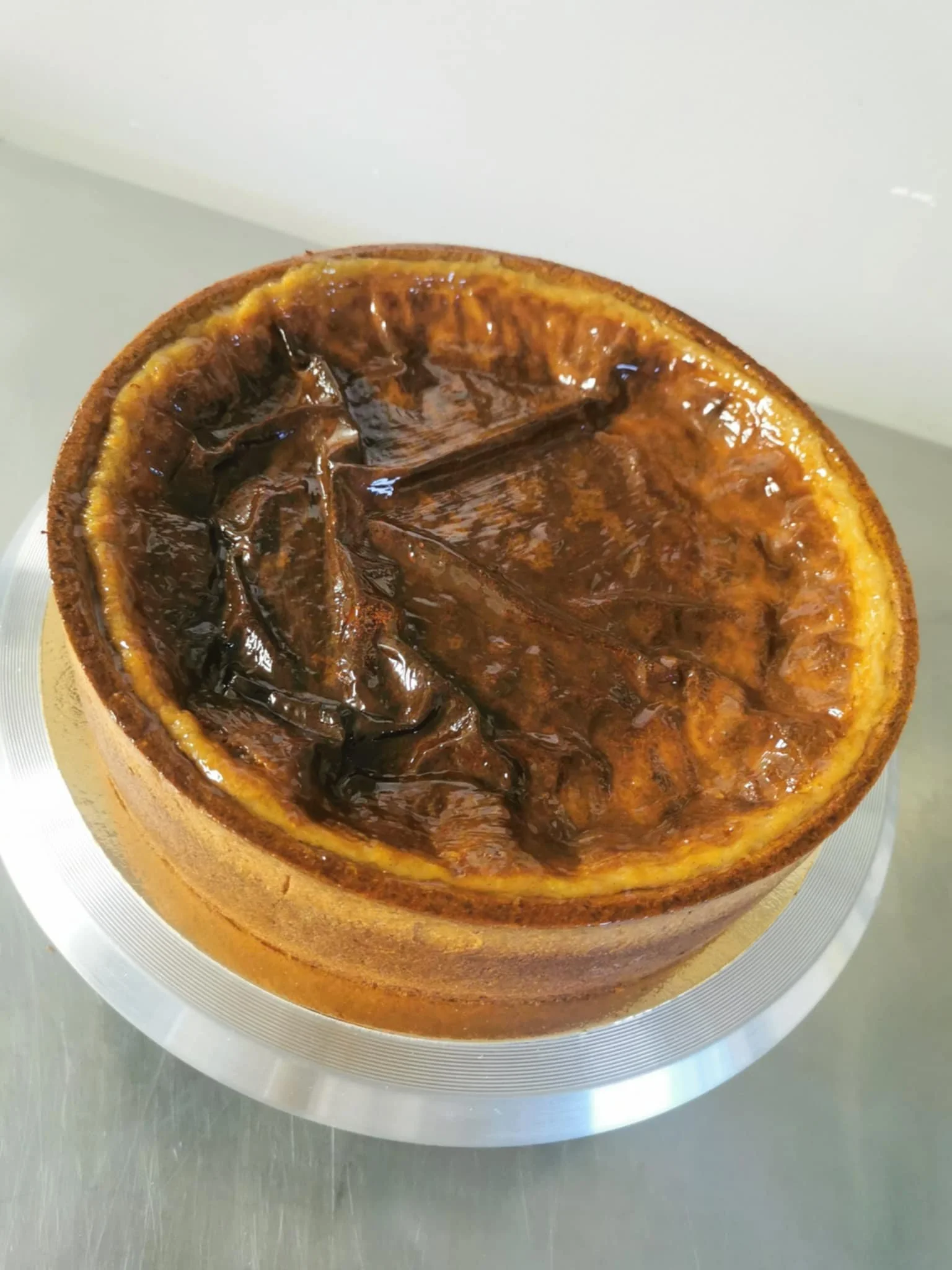 Un dessert rond avec une couche de cacao en poudre, placé sur une surface en pierre.