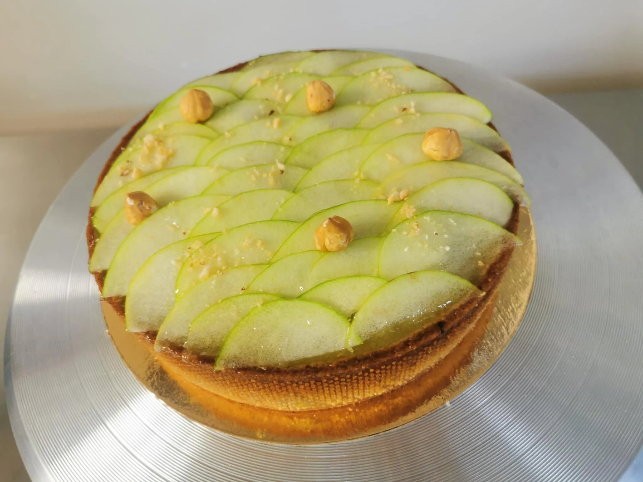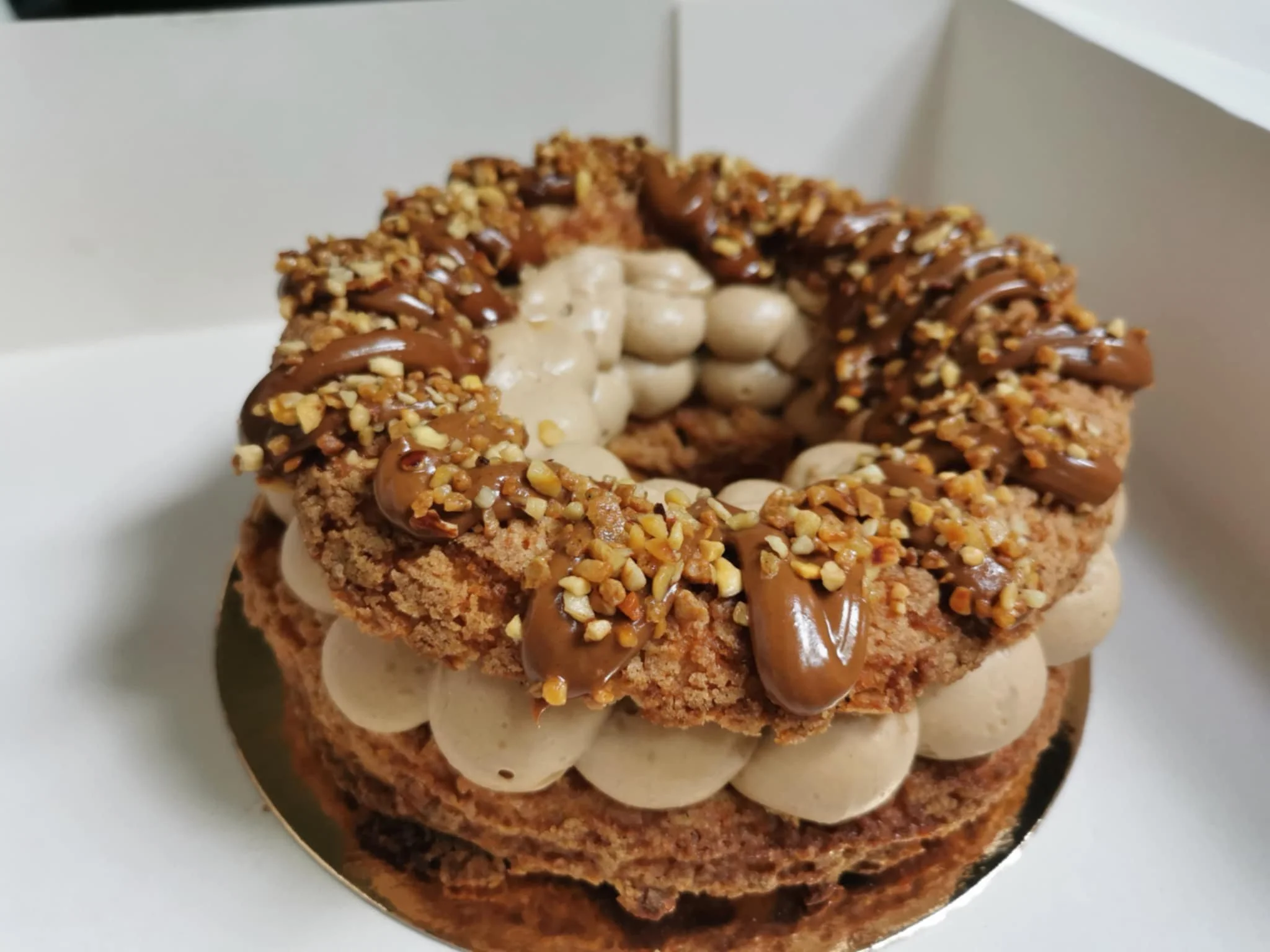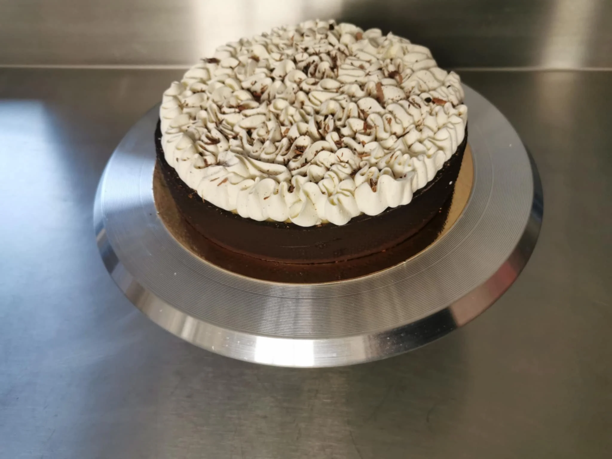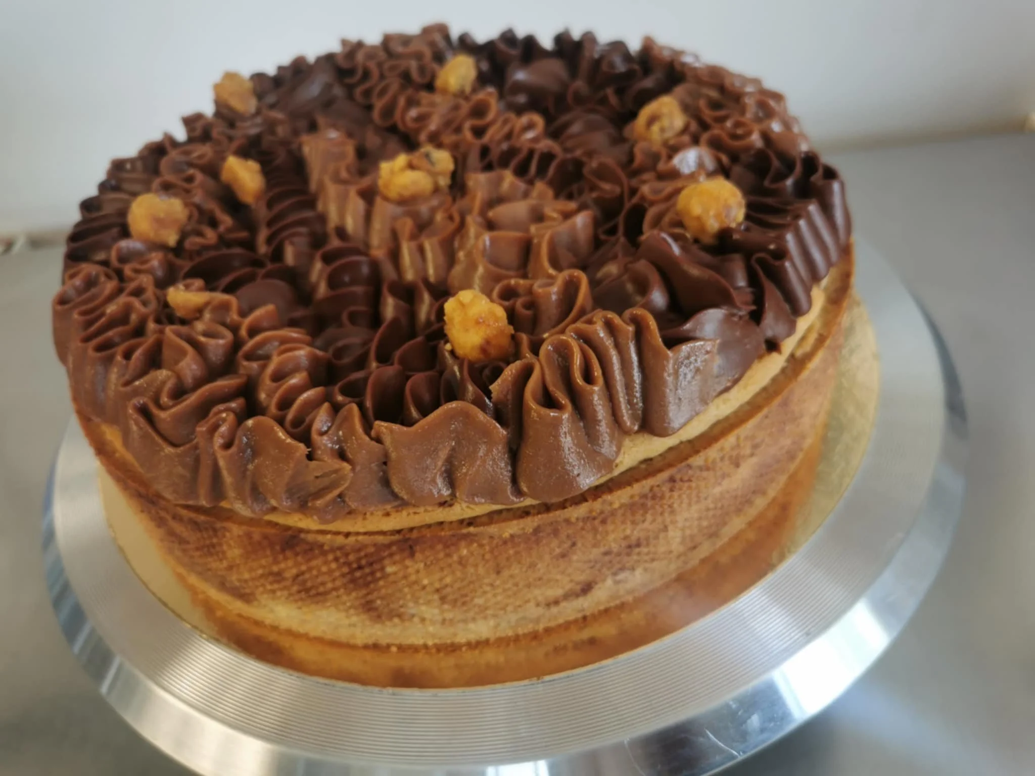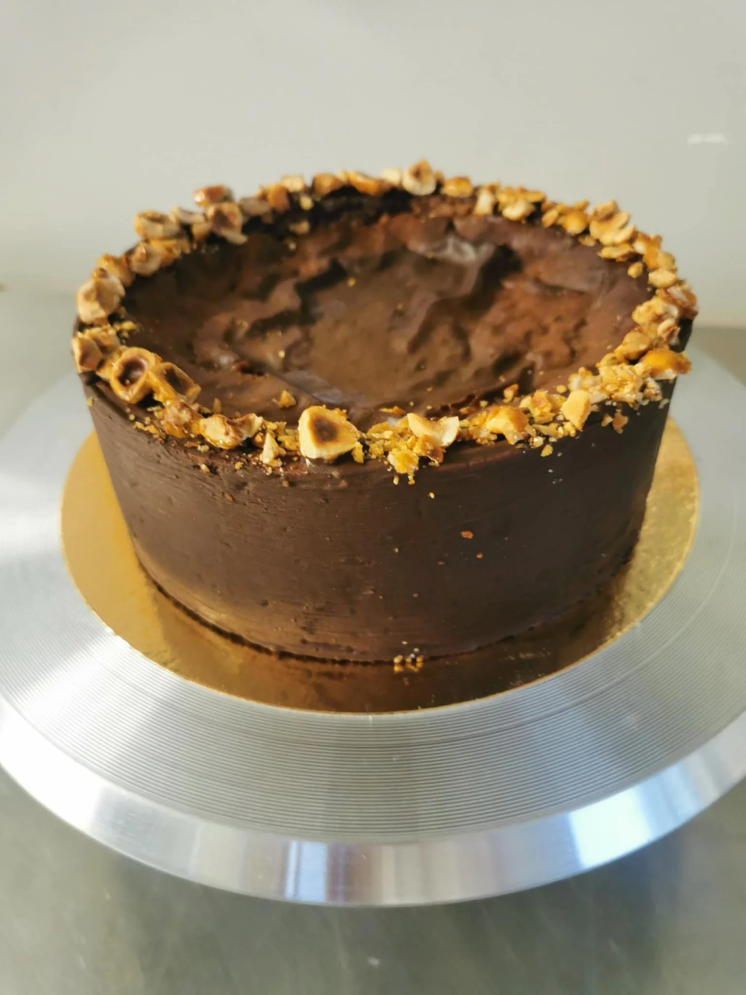 Gâteau décoré avec de la crème blanche et une noisette, placé sur une grille en métal.