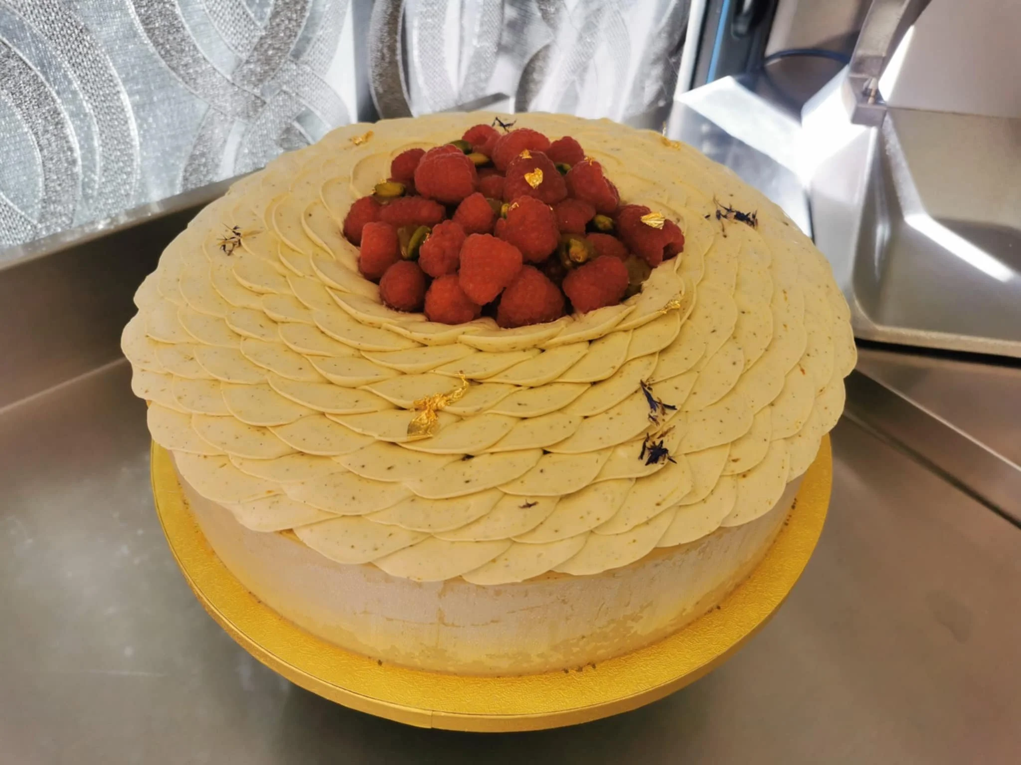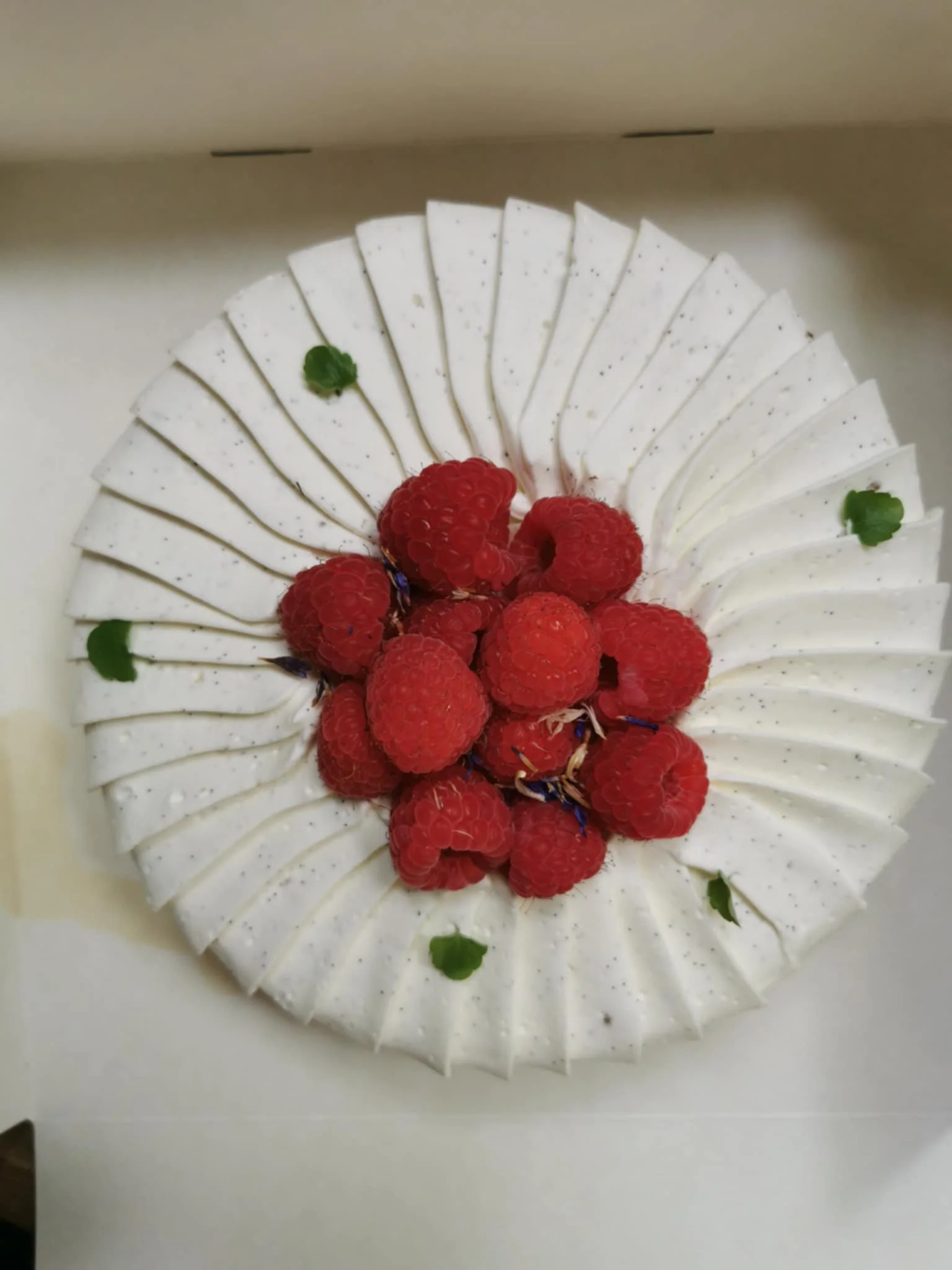 Gâteau décoré avec des morceaux de crème, des framboises et des feuilles de menthe.