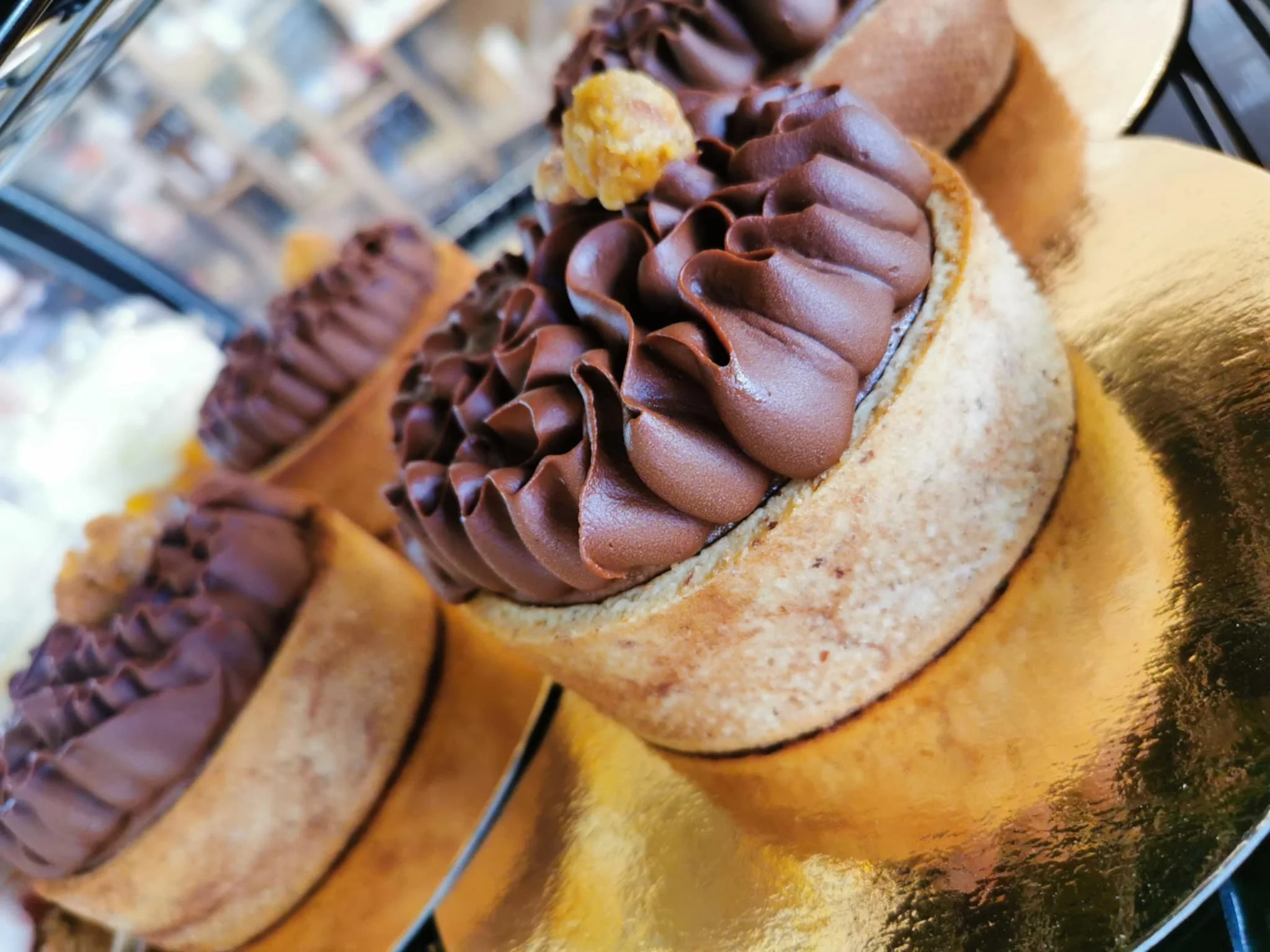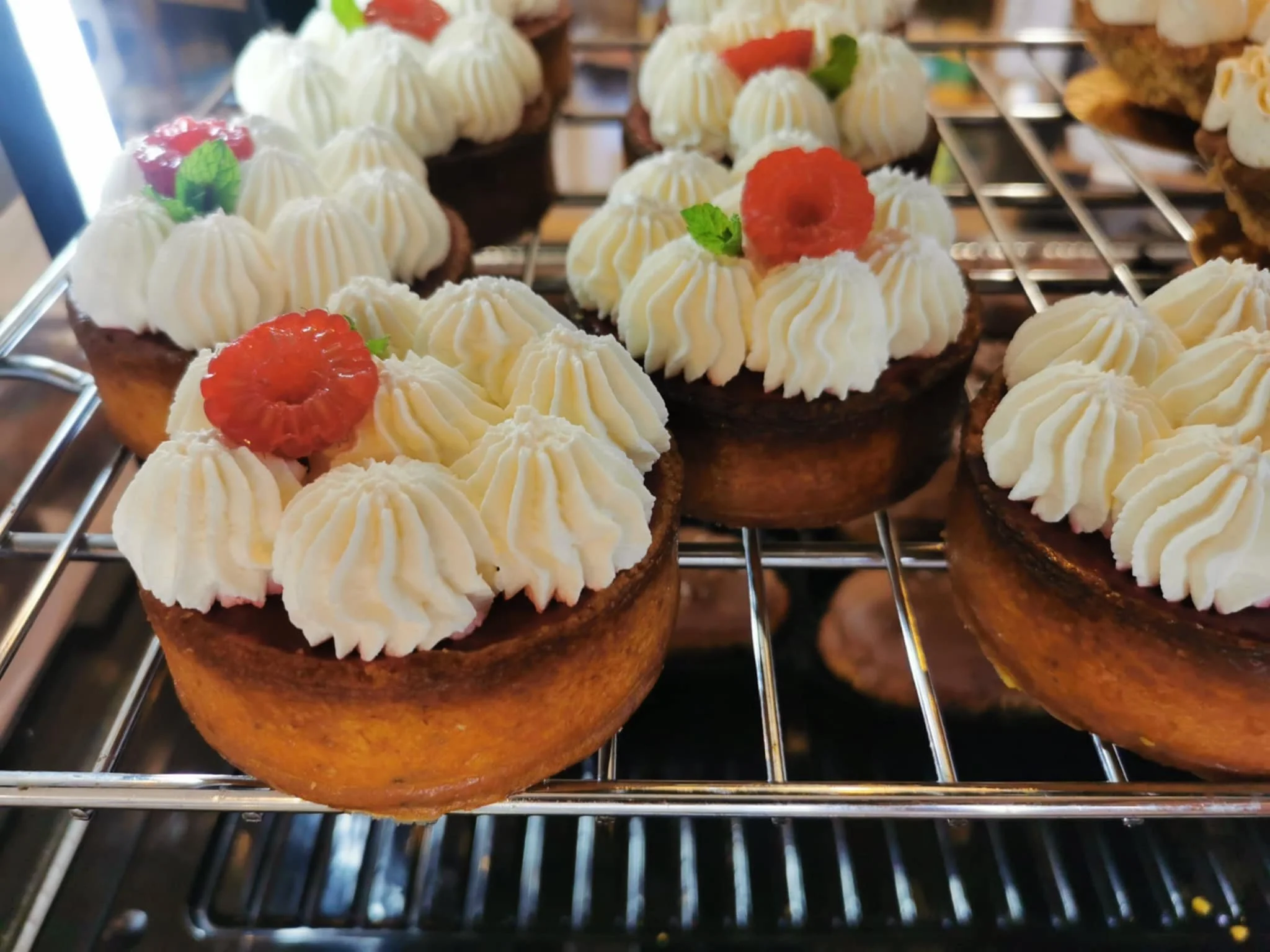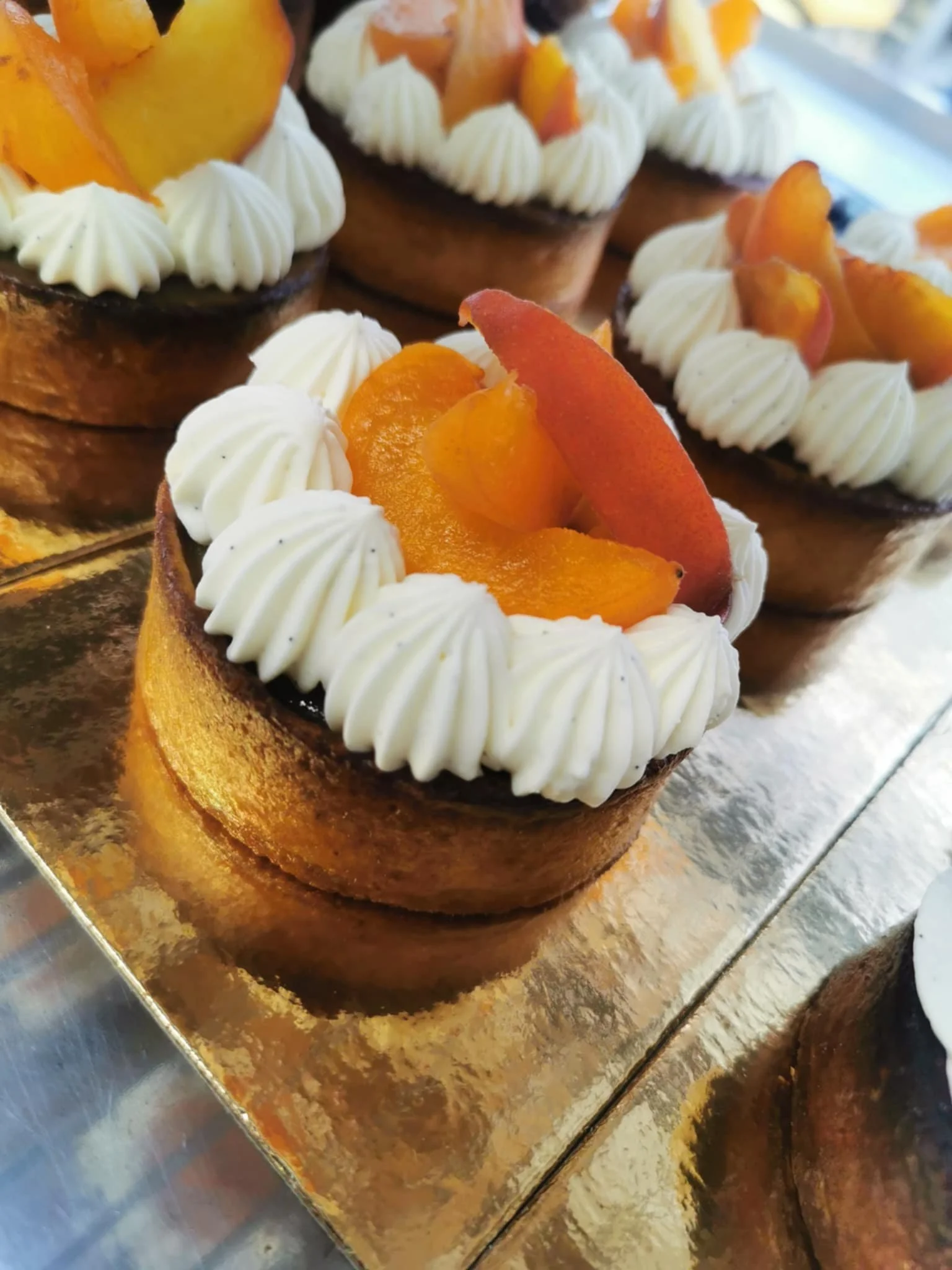 Gâteaux individuels ornés de crème fouettée et de petites fleurs violettes, sur des plateaux en doré.