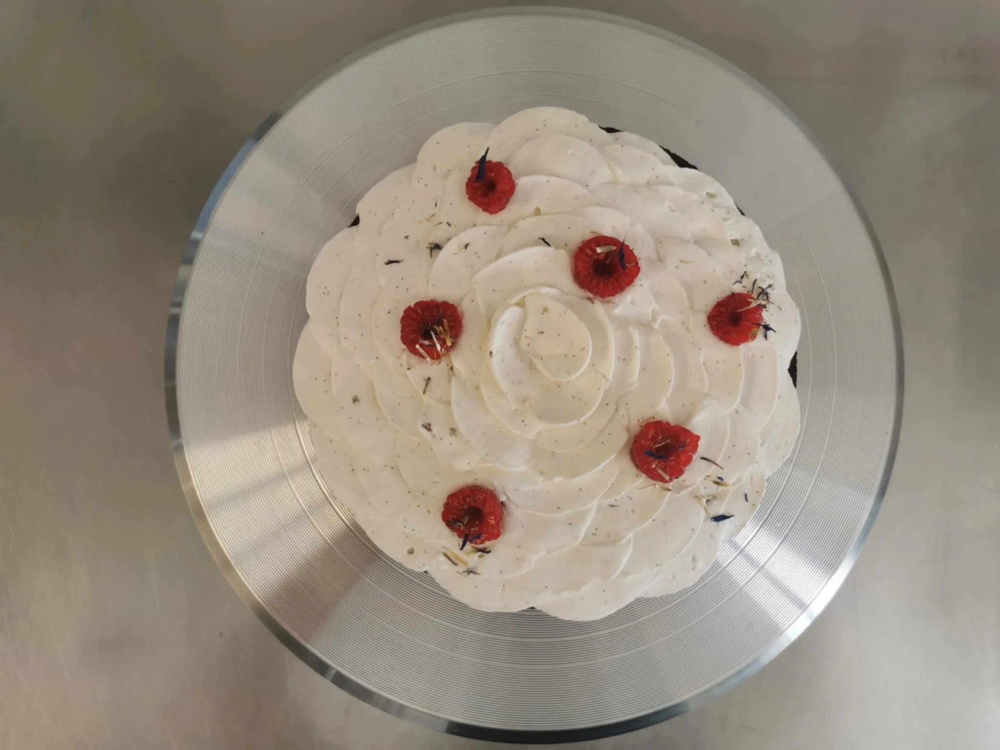 Gâteau rond décoré avec de la crème, des zestes d'agrumes, des fleurs violettes et vertes, sur une assiette en plastique