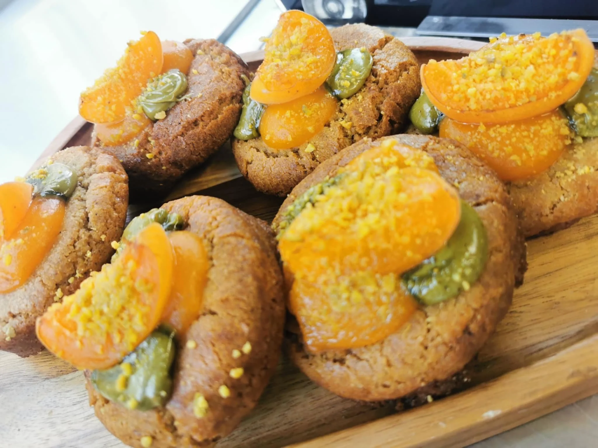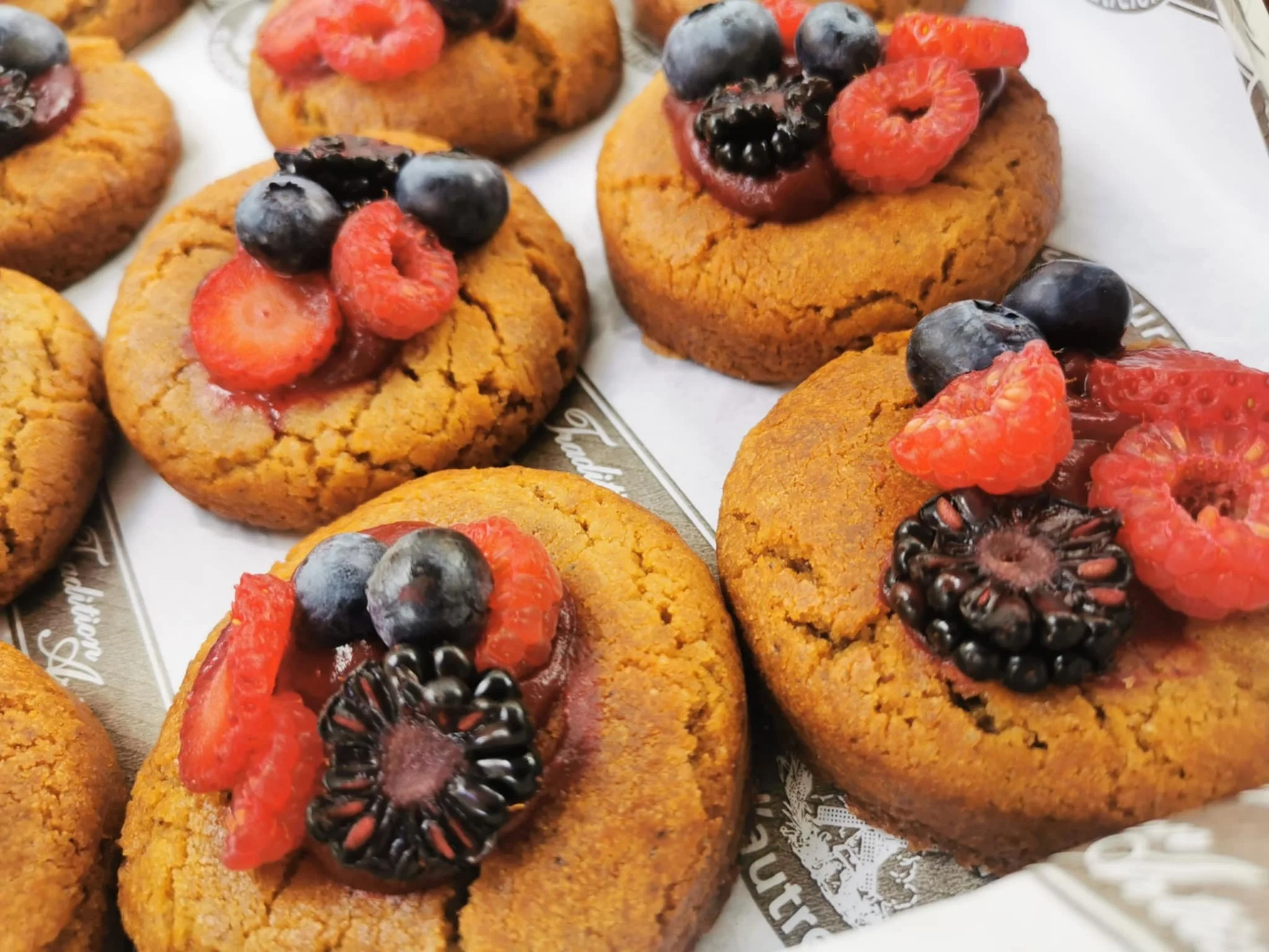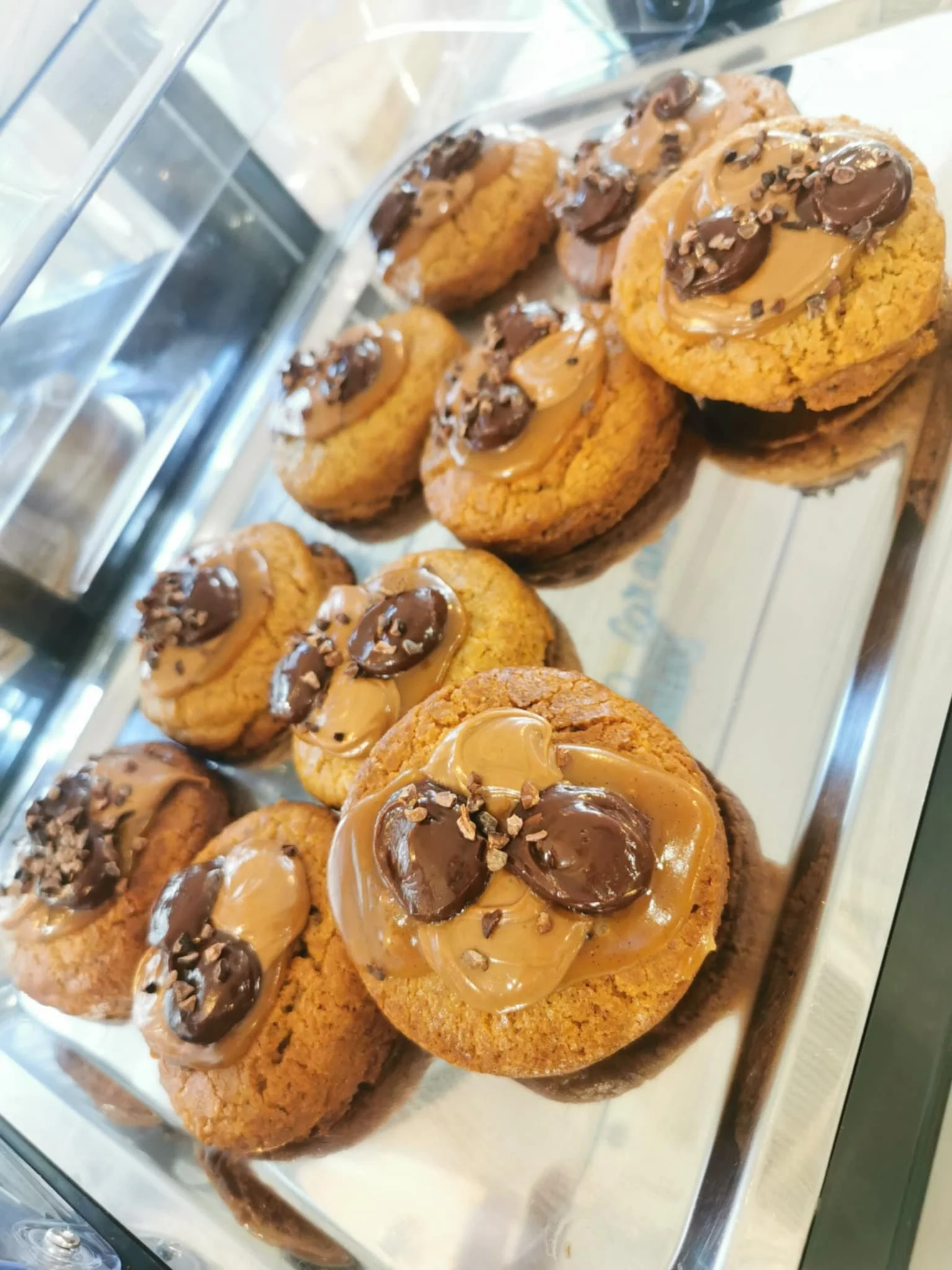 Vitrine de pâtisseries avec cookies, cannelés bordelais, cookies aux fruits rouges, biscuits croquants aux amandes, et biscuits cookies avec différentes saveurs.