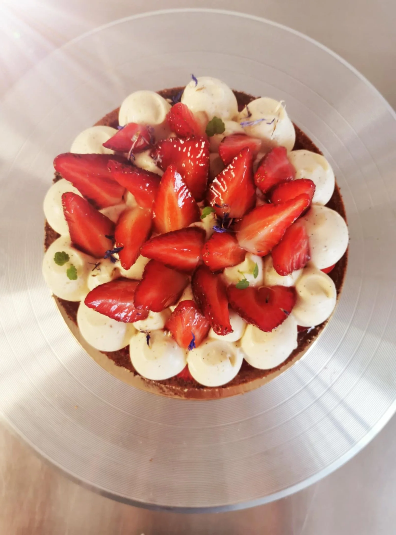 Gâteau décoré avec des morceaux de fraises, des petites perles de crème, des herbes aromatiques et des fleurs violettes, vu du dessus.