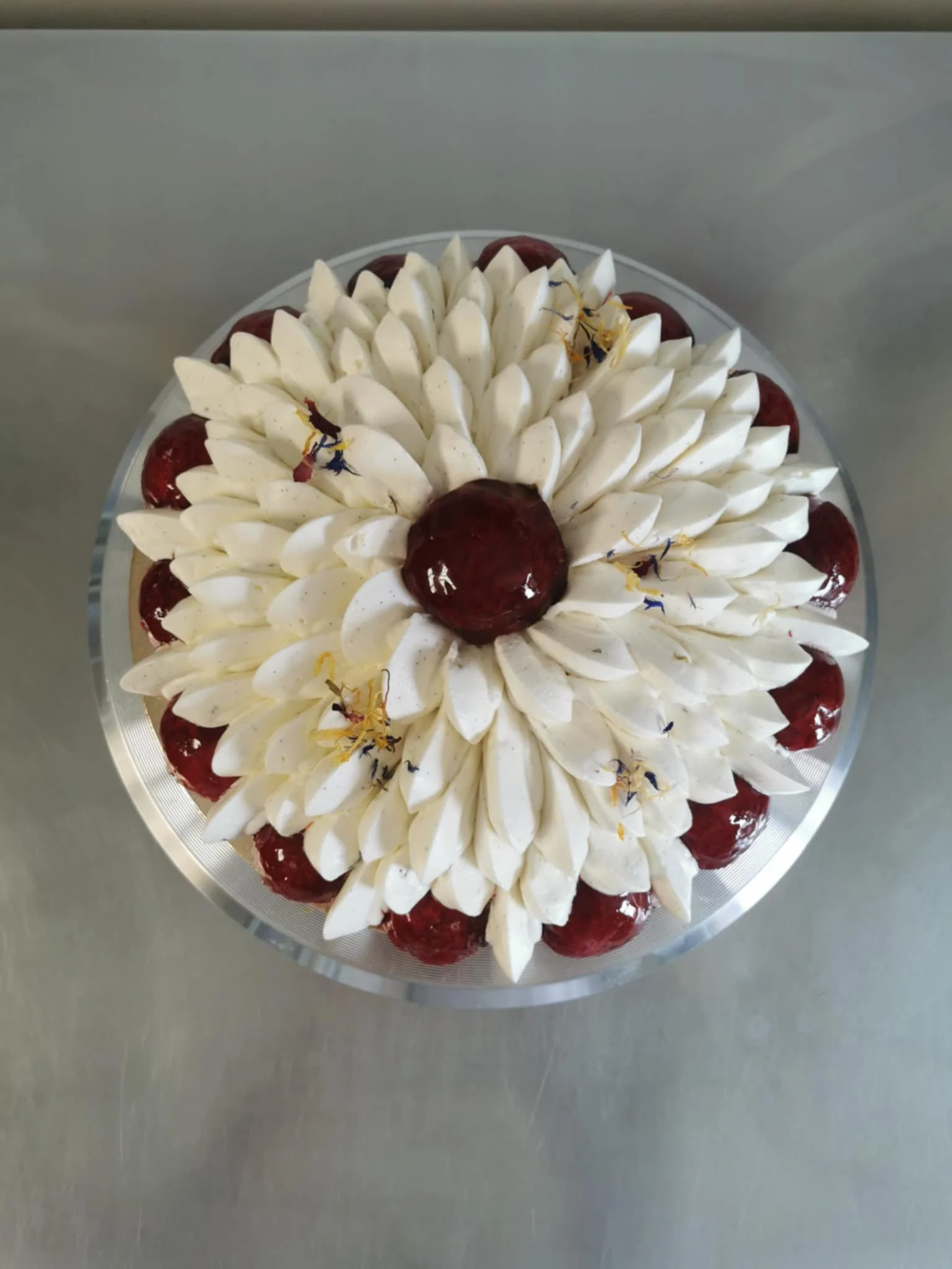 Petite pâtisserie avec décor de crème blanche et morceaux de mangue au centre, parsemée de petites fleurs violettes sur un fond de surface en pierre.