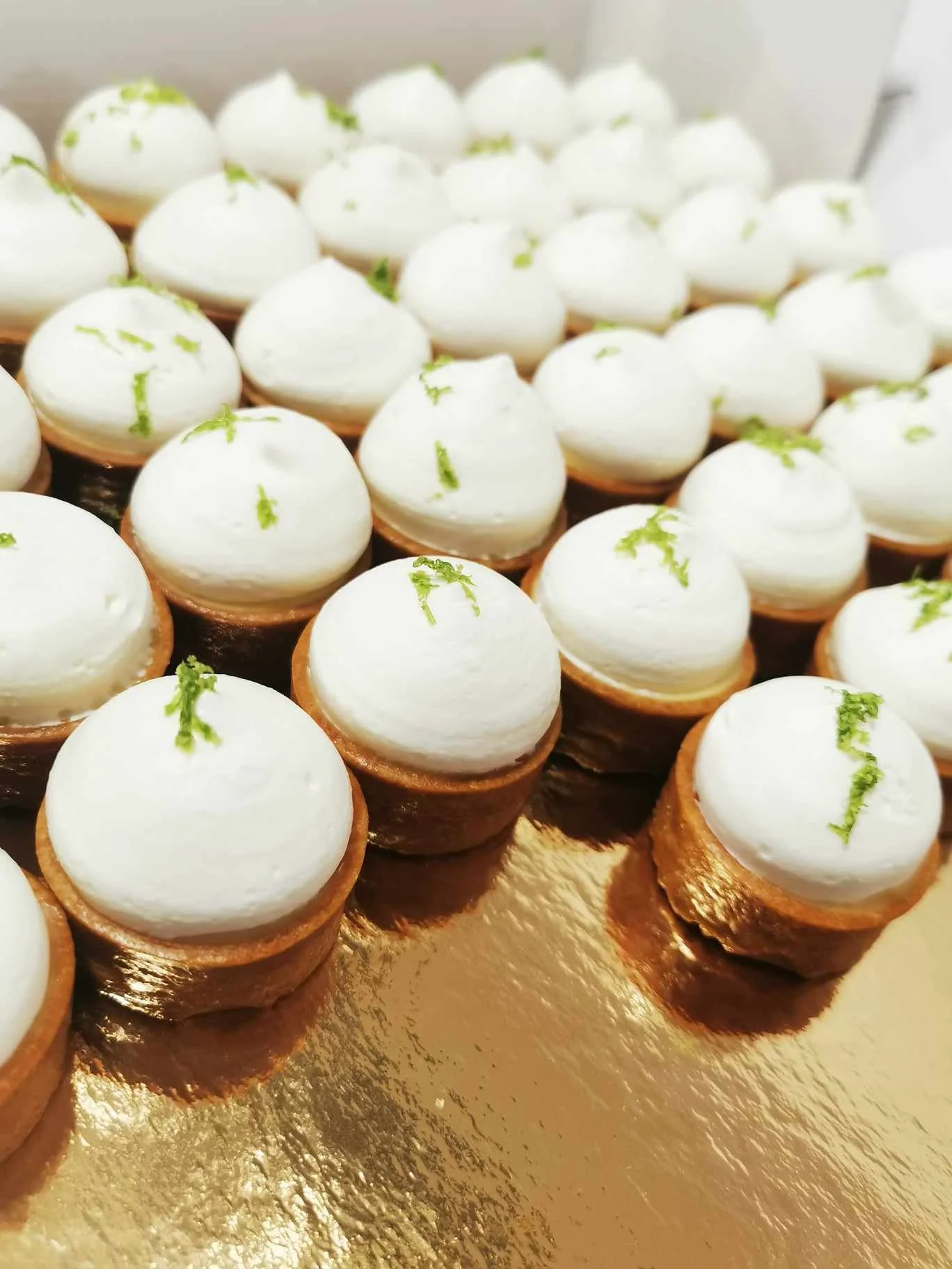 Tartes aux citrons décorées de meringue et de zeste de citron vert.