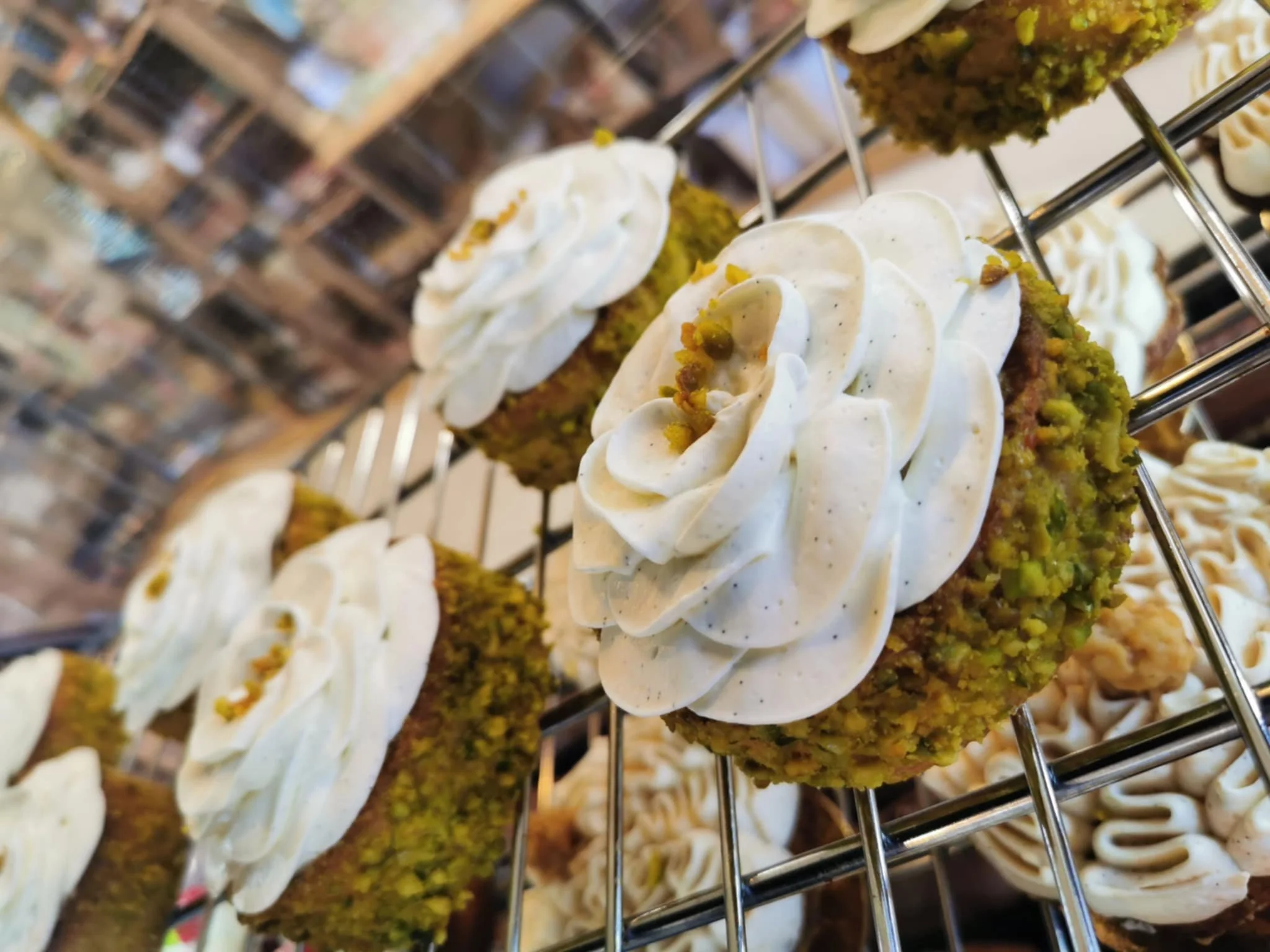 Un dessert avec une base croustillante, une couche de crème blanche, décoré de crème fouettée et de pistaches moulues